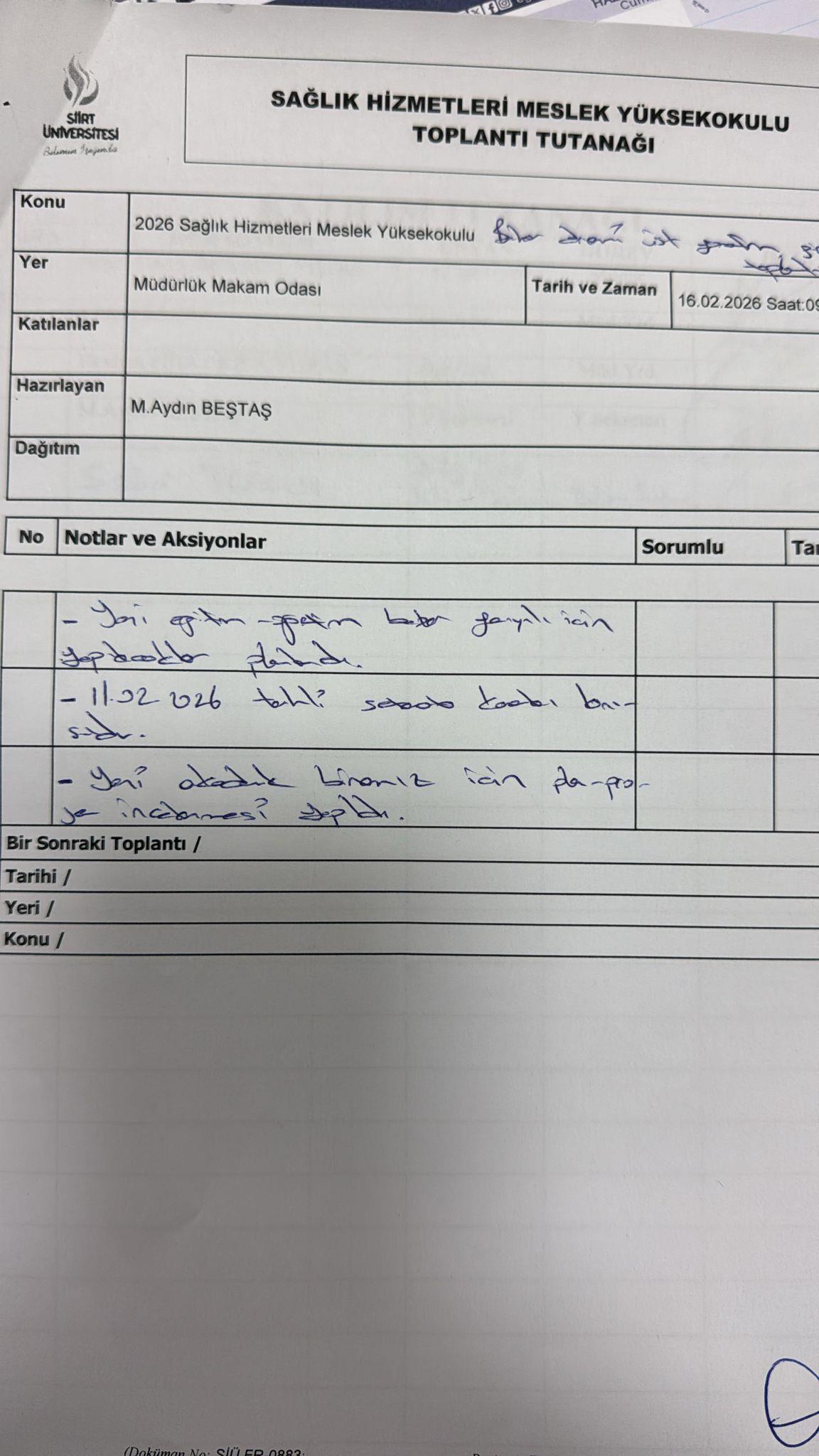 Müdürümüz Dr. Öğr. Üyesi Büşra Ceren DEMİREL YILDIZ'ın başkanlığında, Müdür Yardımcılarımız Öğr. Gör. Çimen SABAZ, Öğr. Gör. Reyhan FIRAT KILIÇVURAN, Bölüm Başkanımız Dr. Öğr. Üyesi Sabri TOĞLUK ve Yüksekokul Sekreterimiz M. Aydın BEŞTAŞ'ın katılımıyla 2025-2026 Bahar Yarıyılı faaliyetleri üzerine bir toplantı yapıldı.